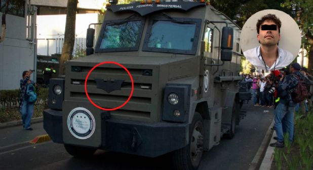 Y en plena labor de traslado hacia a las instalaciones de la Fiscalía Especializada en Materia de Delincuencia Organizada de la Fiscalía General de la República, se dejó ver un vehículo muy peculiar que tenía incrustado al frente una placa del logo de Batman, personaje de DC Comic y protagonista de múltiples historietas y películas.
