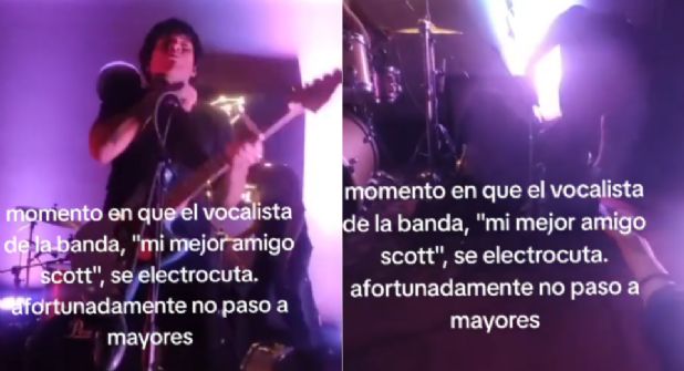 En las imágenes, que comenzaron a circular principalmente en TikTok, se observa cómo el vocalista toma el micrófono y de manera repentina, recibe una descarga eléctrica que lo hace perder el control y caer hacia atrás, impactando contra la batería del grupo.