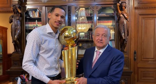 Ciudad de México. - Tras la conferencia de prensa de la mañana de este lunes, el presidente Andrés Manuel López Obrador recibió en Palacio Nacional al primer mexicano campeón en la NBA, Juan Toscano Anderson.