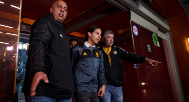 Finalmente, antes de las 5:00 de la mañana, la figura de Diego Lainez, portando una chaqueta gris con vivos negros y el escudo de Tigres del lado izquierdo, apareció por fin en las puertas de salida del Aeropuerto, escoltado por el jefe de prensa felino y un guardia de seguridad del club.