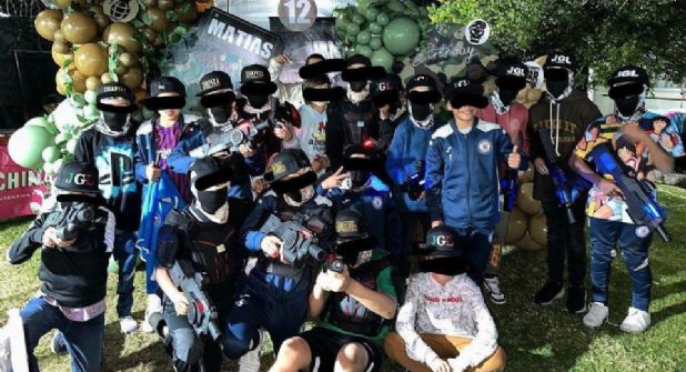 En las fotografías se observa una dinámica entre los niños, en la cual simulaban un enfrentamiento armado utilizando armas y chalecos eléctricos. Además, en las fotografías se aprecian que algunos de los niños invitados usan gorras con la palabra “Chapiza”, junto al escudo institucional del Cruz Azul.