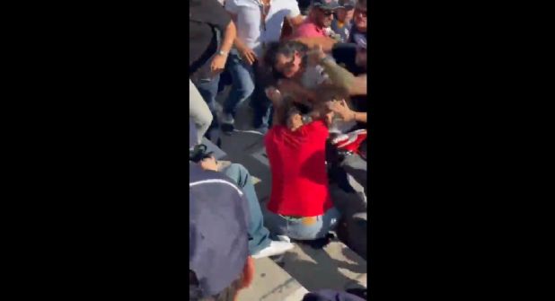 En el material se muestra a un hombre de playera blanca, quien fue contra dos varones vestidos de rojo que se encontraban sentados, mientras una mujer intercedió e intentó detener los ataques, pero fue derribada por el mismo sujeto.