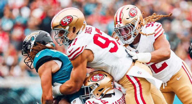 La defensiva de San Francisco también destacó con cinco capturas de 'quarterback', dos intercepciones y provocó dos balones sueltos