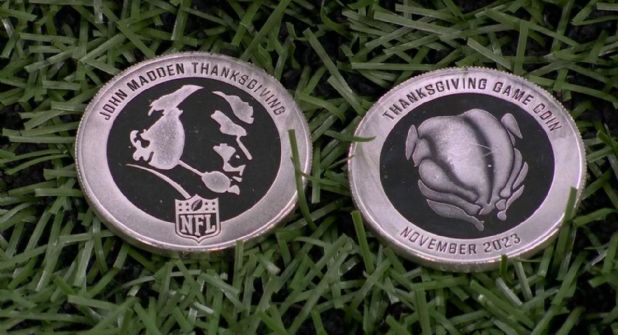 La moneda especial realizada por la NFL luce por un lado la cara de Madden, fallecido en 2021, y por el otro un pavo, la comida tradicional en Estados Unidos en el Día de Acción de Gracias.