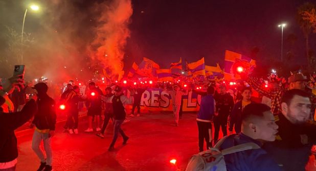 Para la caravana prendieron bengalas, encendieron fuegos pirotécnicos y ondearon banderas, además de mantas, en apoyo al equipo.