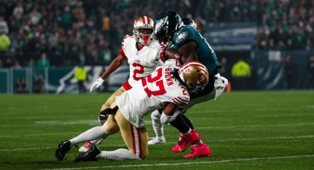 Los Eagles dominaron el inicio; tomaron ventaja 6-0 con dos goles de campo en el primer cuarto, pero San Francisco dio la vuelta 6-14 en el segundo periodo gracias a una recepción de Brandon Aiyuk y un acarreo de Christian McCaffrey, quien en este juego sumó 93 yardas con las que superó las 1.000 por tierra en la campaña.