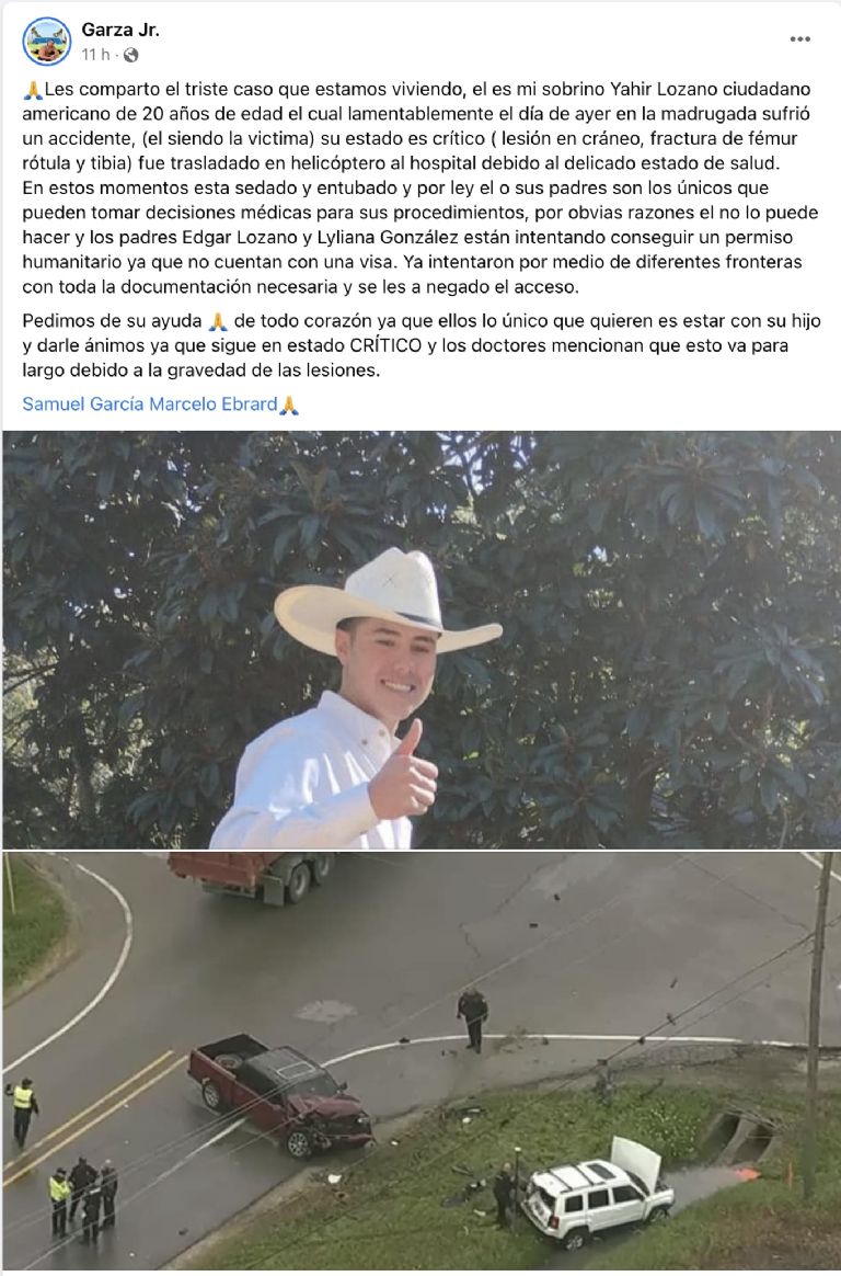 Garza publicó en sus redes sociales que Yahir Lozano, de 20 años de edad, sufrió un accidente de tránsito que lo dejó en estado crítico, con una lesión en el cráneo, fractura de fémur, rótula y tibia, por lo que fue trasladado en helicóptero a un hospital de Houston, Texas, la ciudad en la que vive.