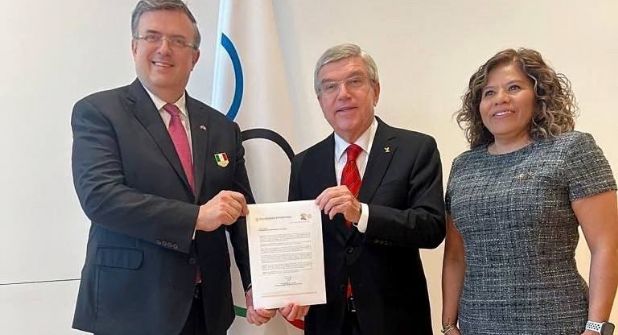 Ebrard, canciller mexicano y la presidenta del Comité Olímpico Mexicano (COM), María José Alcalá, entregaron una carta a Thomas Bach, dirigente del comité Olímpico Internacional (COI), que representa la candidatura oficial del país.