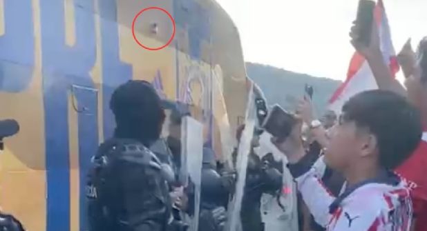 En medio de cánticos hostiles y una lluvia de objetos, uno de los cuales dañó uno de los vidrios laterales, pasó el autobús felino rumbo al estadio.