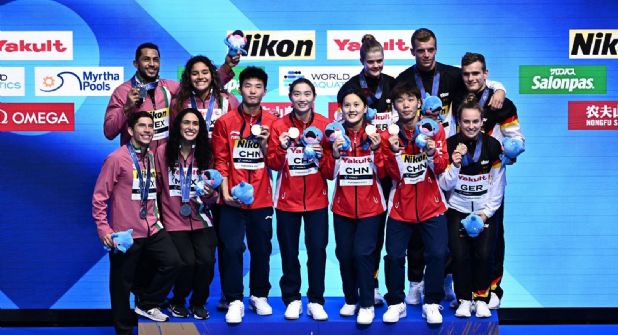 Japón.- El equipo mexicano conformado por los clavadistas Gabriela Agúndez, Jair Ocampo, Randal Willars y Aranza Vázquez, termino segundo en la prueba de saltos mixtos por equipos en el Campeonato Mundial de Natación que se celebra en Fukuoka, Japón.