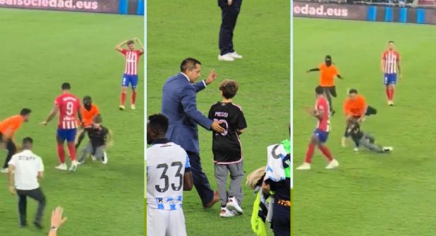 Un video captado por la cámara de ABC Deportes muestra el momento en que un menor de edad, con el jersey de Lionel Messi, cruza la cancha del estadio de Rayados, pero fue derribado antes de llegar a la zona donde estaban los jugadores.