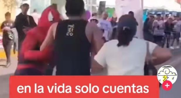 La sorpresa de los espectadores fue mayúscula cuando el hombre con disfraz del personaje de Marvel Comics detiene su paso y regresa, para auxiliar al joven y apoyar a su mamá, para llevarlo a la línea de meta.