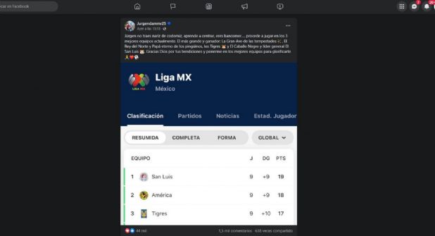 En su cuenta de Facebook, Damm, posteo una foto de los primeros tres equipos de la tabla general, los cuales también son sus últimos clubes en La Liga MX.