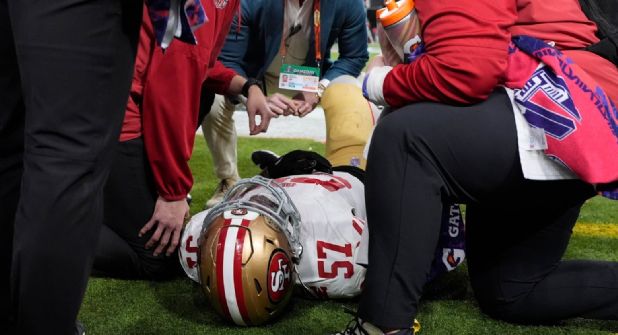 Estados Unidos.- Dre Greenlaw, 'linebacker' de los San Francisco 49ers, se lesionó en el tendón de aquiles durante el segundo cuarto del Super Bowl cuando entraba desde la banda al campo.