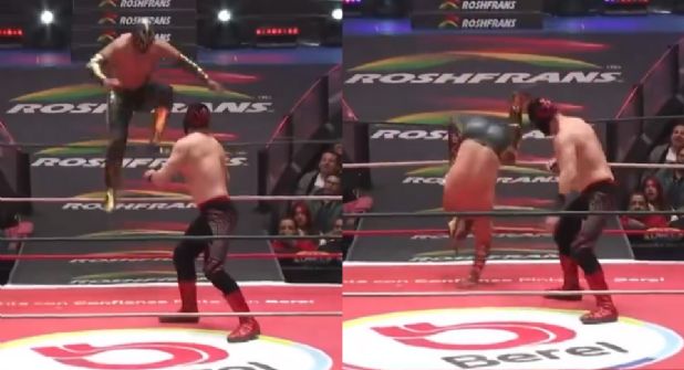 Al enredarse, la pierna derecha de Oro Jr. terminó completamente doblada, ante la sorpresa de sus compañeros y el público de la Arena México.