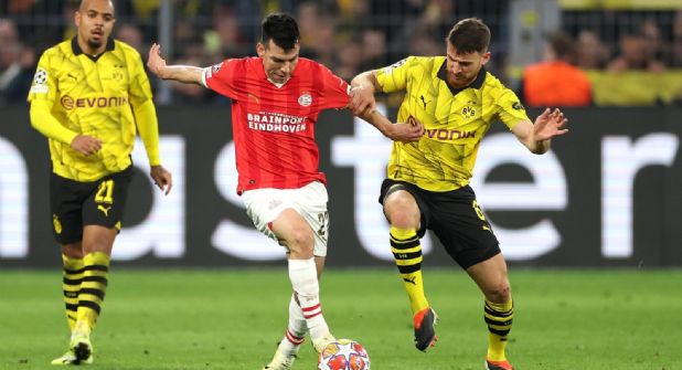 El Dortmund tuvo un buen primer tiempo y una segunda parte en la que se vio dominado por el PSV, pese a lo cual, ya en el descuento, logró el segundo gol que eliminó cualquier duda.