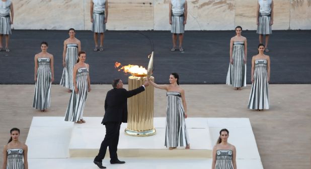 Al igual que en la ceremonia de encendido de la llama en la antigua Olimpia, en el acto de entrega también destacó el papel central de jóvenes sacerdotisas vestidas con trajes tradicionales.