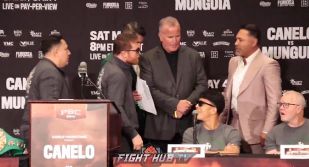 Las Vegas.- Saúl Álvarez y Óscar de la Hoya estuvieron a punto de llegar a los golpes durante la conferencia de prensa para la pelea entre “Canelo” y Jaime Munguía.