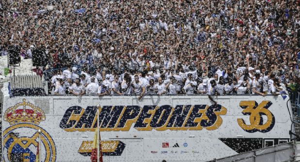 Tras poner fin a la celebración en la Comunidad de Madrid, el Real Madrid se dirige al Ayuntamiento como última parada antes de dirigirse a Cibeles en un autobús descapotable.