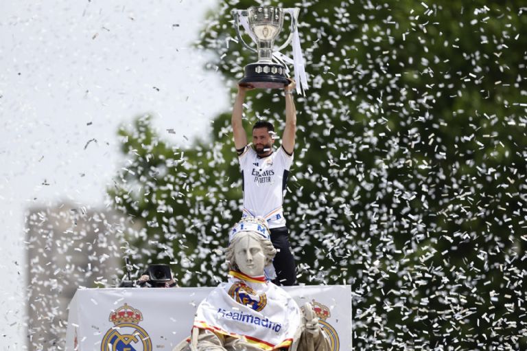 El último en bajar del autobús fue el capitán, Nacho Fernández, con el trofeo de Liga tras recibirlo de manos del presidente de la Real Federación Española de Fútbol (RFEF), Pedro Rocha, en un acto privado en el estadio Alfredo Di Stéfano a primera hora de la mañana.