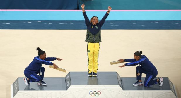 Fue la segunda vez en pocos minutos en que la brasileña superaba a Biles, tras acabar también por delante en la barra de equilibrio, aunque ambas fuera del podio.