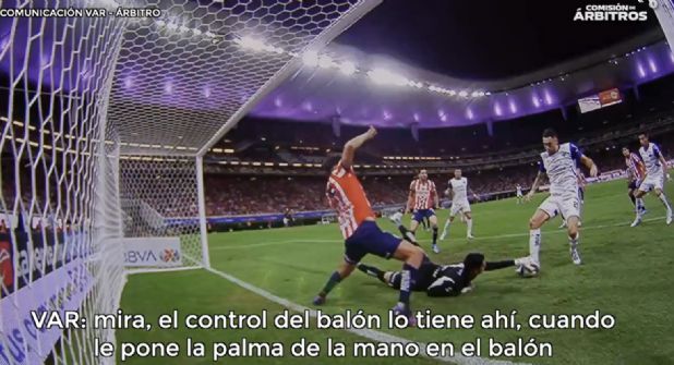 “En una segunda instancia, el portero controla el balón con una de sus manos, el balón se encuentra entre el suelo y la mano del portero”, se explica en el video publicado por la Comisión de Árbitros.
