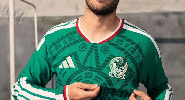 El jersey mantiene el clásico tono verde, color característico del representativo mexicano, acompañado de detalles en rojo y blanco en los puños y el cuello, en alusión a la bandera nacional. En el frente destaca un patrón gráfico basado en la Piedra del Sol, uno de los íconos más representativos de la cultura azteca, mientras que en la parte posterior, debajo del cuello, aparece la leyenda “SOMOS MÉXICO”.