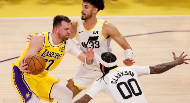Hacia las 19.45 horas de Los Ángeles, Doncic pisó por primera vez la cancha del estadio Crypto.com Arena con el 77 y la camiseta de púrpura y oro.
