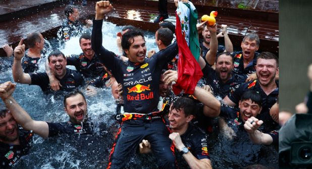 'Checo' alcanzó uno de sus mejores momentos en su carrera en el 2022, con su tercera victoria en el 'Gran Circo', que celebró lañándose a la piscina acompañado por el expresidente de México, Felipe Calderón.