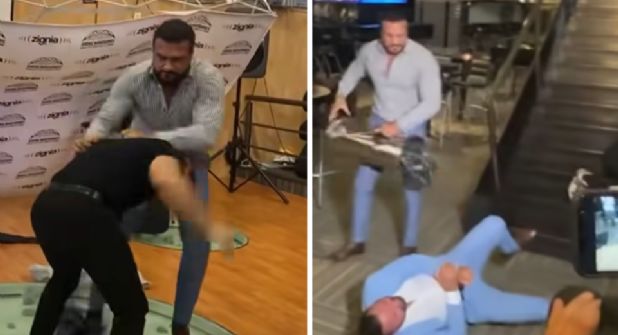 Luego de arrojarlo al suelo, Alberto tomó un contenedor de basura y lo colocó en el brazo izquierdo del actual director de Talento y, con una silla, azotó la extremidad del exluchador, quien no pudo levantarse del golpe.