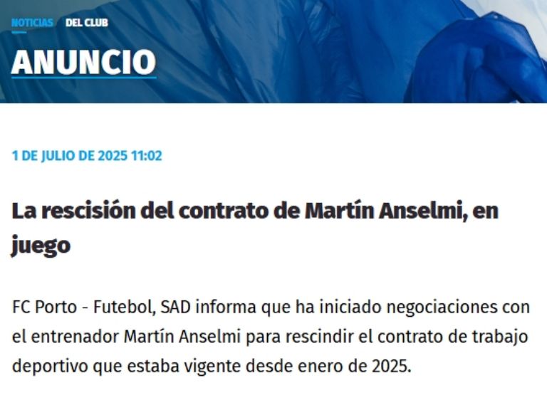 Lisboa.- El Oporto está en negociaciones con el técnico argentino Martín Anselmi para rescindir su contrato, tras haber llegado al equipo del norte de Portugal en enero pasado, según confirmó este martes el club.