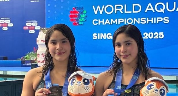 Singapur.- Las hermanas gemelas, Lía y Mía Cueva ganaron la medalla de bronce para México en su debut en el Campeonato Mundial de Deportes Acuáticos, con 14 años de edad.