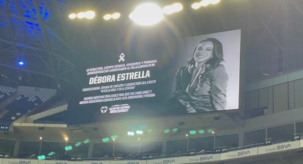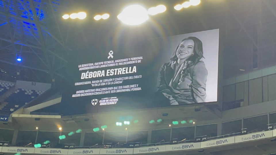 Monterrey.- Previo al arranque del partido entre Rayadas y Pachuca Femenil, el Estadio BBVA rindió un homenaje a la comunicadora Débora Estrella, quien falleció recientemente. Como muestra de respeto, se guardó un minuto de silencio acompañado de un mensaje proyectado en las pantallas del inmueble.