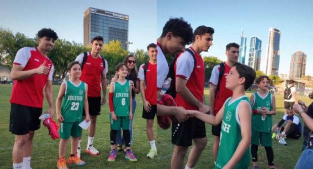 Se aprecia en el video que los dos niños, de nombre Bernardo y Roberto, sostienen un dialogo con jugadores de la selección nacional de Irak, entre ellos Ali Yousef, una de las figuras del equipo.