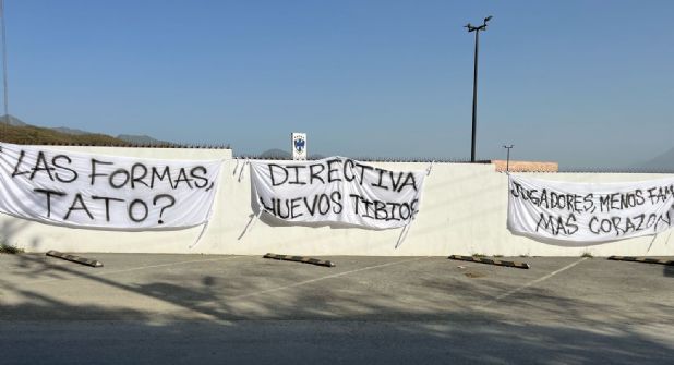 Monterrey.- La molestia de la afición de Rayados quedó plasmada en forma de mantas, colocadas como protesta en El Barrial.