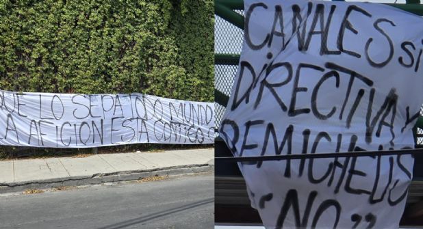 “Canales si, directiva y Demichelis no”, dice una de las mantas, mientras que la otra también manifiesta el apoyo hacia el cántabro: