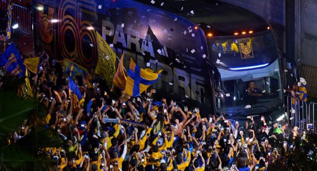 En los Cuartos de Final y la Semifinal de Vuelta de este torneo, el arribo al Estadio Universitario estuvo marcado por una presencia multitudinaria, cánticos y humo azul y amarillo que acompañaron el paso del autobús felino. Sin embargo, para el inicio de la serie por el título, el escenario fue distinto desde minutos antes de la llegada del plantel.