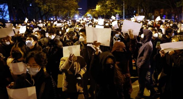 Imágenes difundidas en las redes sociales muestran a varios cientos de personas en los márgenes del río Liangma, en el poblado distrito de Chaoyang, que cantan y gritan consignas como "no más confinamientos", muchos de ellos enarbolando folios en blanco.