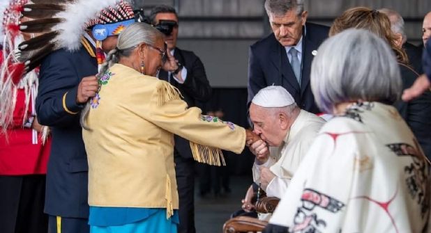 "Decirles, de todo corazón, que estoy profundamente dolido: pido perdón por la manera en la que, lamentablemente, muchos cristianos adoptaron la mentalidad colonialista de las potencias que oprimieron a los pueblos indígenas", dijo Francisco sentado entre los representantes de los jefes de los pueblos originarios y ante más de 2.000 personas, entre ellas muchas víctimas de estos internados.