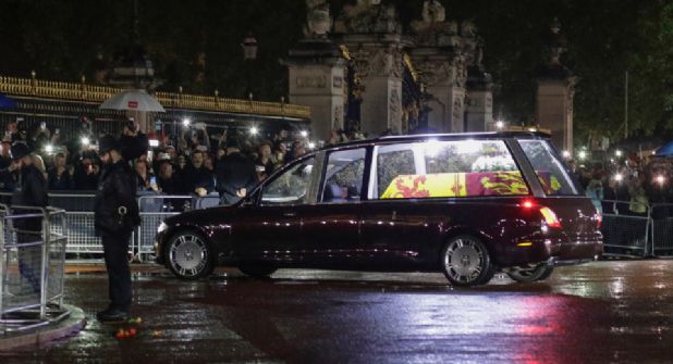 Ante la mirada de la princesa Ana, única hija de Isabel II, que acompañó a los restos mortales en el vuelo hacia Londres, así como de la primera ministra británica, Liz Truss, y el ministro de Defensa, Ben Wallace, el ataúd fue introducido en un vehículo Jaguar Land Rover fúnebre que se estrenaba para la ocasión. En su diseño participó personal de la Casa Real y fue consultada la propia reina.
