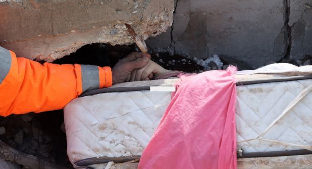 En esta imagen se alcanza a apreciar parte de la mano de la adolescente. Diversos medios han manifestados que testigos de este momento escucharon que Mesut Hancer le decía a su hija “Papi está aquí”, mientras esperaba que algún rescatista llegara para ayudarle a liberar de los escombros el cuerpo ya inerte de Irmak, su hija.