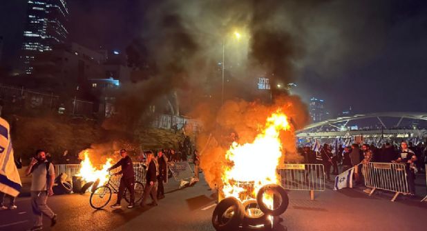 En Tel Aviv, los manifestantes bloquearon el tráfico de la principal arteria de la ciudad, portando banderas israelíes y al grito de "Democracia, democracia".