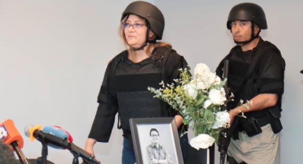 "Quiero decirle al correísmo (...) que todos ellos son responsables sino directos o indirectos de la muerte de mi esposo, pero fue en este Gobierno que murió mi esposo y es el que tiene que dar explicaciones", alegó Sarauz, quien llegó a la rueda de prensa con chaleco y casco antibalas y flanqueada por un miembro de seguridad que portaba fusil.