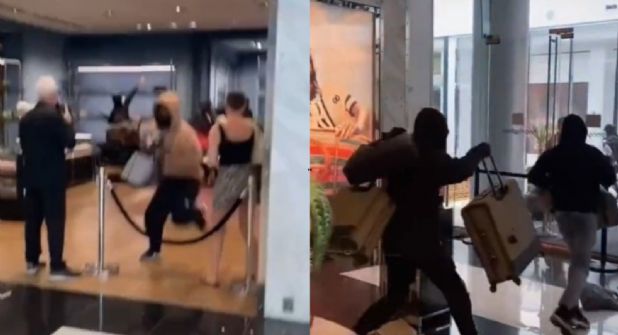 Asimismo, en la grabación se ve como los presuntos ladrones salen corriendo de la tienda trayendo consigo bolsas, maletas, ropa y demás artículos de lujo de la tienda; que en total suman una fuerte cantidad de dinero.