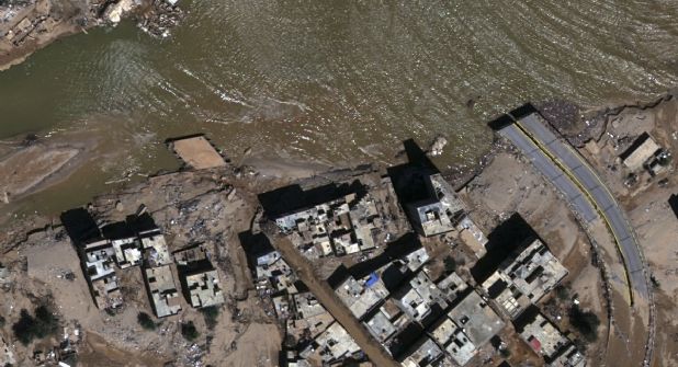 En imágenes que circulan de la ciudad de Derna, de 100 mil habitantes, se aprecian varios edificios en las orillas de un río, así como también pequeñas casas que desaparecen entre las aguas crecidas después de que se rompieran dos represas.