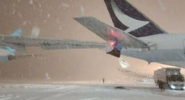 La colisión se suscitó cuando la aeronave de la aerolínea de Korean Air, en donde iban a bordo 189 pasajeros con destino a Séul, estaba siendo retirada por otro automóvil durante los trabajos de retiro de nieve y este se impactara con el avión de Cathay Pacific, el cual iba aterrizando de Hong Kong, el cual estaba vacío.