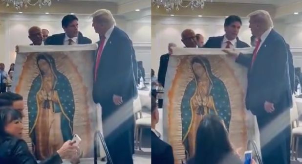 El activista político compartió a través de su cuenta de 'X', antes Twitter, un video en el que aparece junto al exmandatario estadounidense y le hace la entrega de un gran póster de la Virgen.