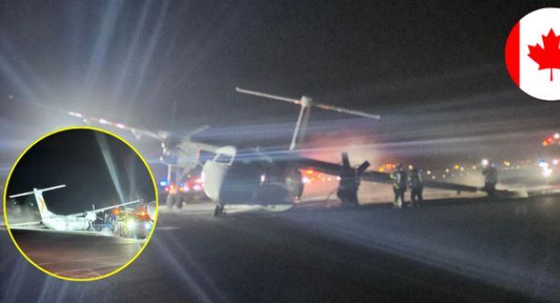 El avión, un De Havilland Canada Dash 8-400, no logró desplegar correctamente uno de sus neumáticos, lo que provocó que el avión se deslizara a un ángulo de unos 20 grados hacia la izquierda.