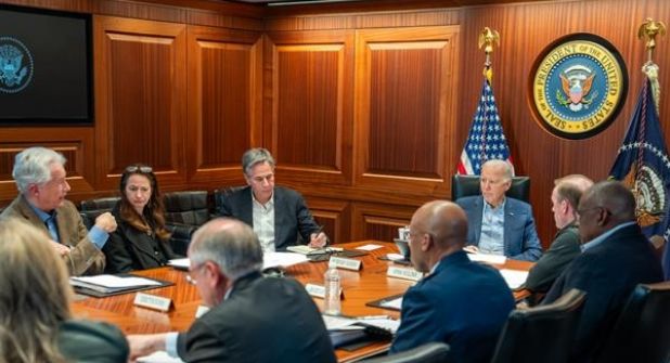 El mandatario acompañó su mensaje en X de una foto del encuentro en la sala de crisis de la Casa Blanca, conocida como 'Situation Room', en la que está junto al secretario de Estado, Antony Blinken, y del de Defensa, Lloyd Austin, entre otros altos funcionarios federales. Tanto a Biden como a Blinken, que aparecen de frente, se les ve con semblante serio, de traje pero sin corbata.