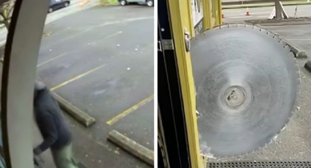 En el video se aprecia el momento en que el hombre camina hacia una cafetería ubicada en Eugene en Oregón, cuando a los segundos de que entra al negocio, la sierra se impacta contra la fachada del restaurante.